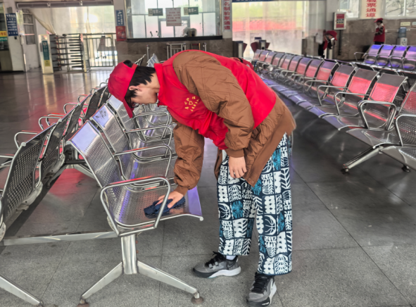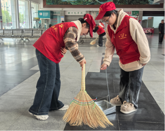 活动现场,志愿者们身着统一的红色马甲,迅速分工,积极投入到清扫工作中。志愿者们手持扫帚和簸箕,一丝不苟地清扫着每一个角落,用抹布细致地擦拭着座椅和围栏的每一处污渍。其余志愿者手握垃圾夹清理车站周边绿化带内的杂草和落叶,还车站一份绿色。在志愿者的共同努力下,汽车站内外环境焕然一新,为乘客提供了一个更加舒适和美观的候车环境。