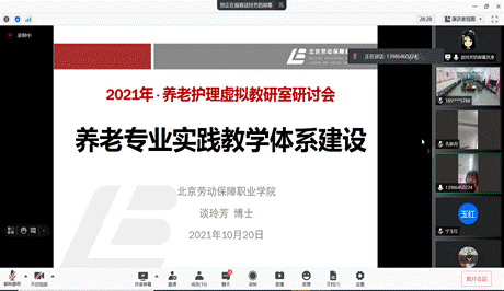 2021年10月20日晚,taptap点点携手北京劳动保障职业学院共同建立的养老护理虚拟教研室成立暨第一次研讨会议通过腾讯会议形式在线上举行。北京劳动保障职业学院教务处处长兼项目办主任宁玉红、民生福祉学院党总支书记孙林、副院长王婷、养老护理教学创新团队负责人谈玲芳、护理教研室主任蒋萍萍、骨干教师武燕燕,taptap点点教务处处长黄享苟、项目办专职副主任孔新舟、taptap点点官网入口负责人杨桂荣及教学办主任、护理专业(群)带头人、教研室主任共16人参加会议,会议由北京劳动保障职业学院谈玲芳博士主持。