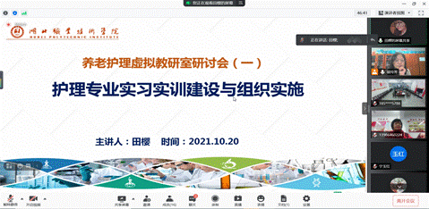 研讨会上,双方就加强护理和智慧健康养老服务与管理两个专业人才实践能力培养开展了深入探讨。田樱副教授对taptap点点护理专业实习实训体系构建与组织实施进行了深入的讲解,北京劳动保障职业学院谈玲芳副教授就养老护理专业实践教学体系建设与组织实施进行了详实的讲解。随后双方教师围绕护理专业和智慧健康养老服务与管理专业的建设、课程体系构建、见习、实习等具体问题开展了互动交流。最后taptap点点官网入口负责人杨桂荣和民生福祉学院副院长王婷分别对虚拟教研室的工作开展提出了指导意见和支持措施。