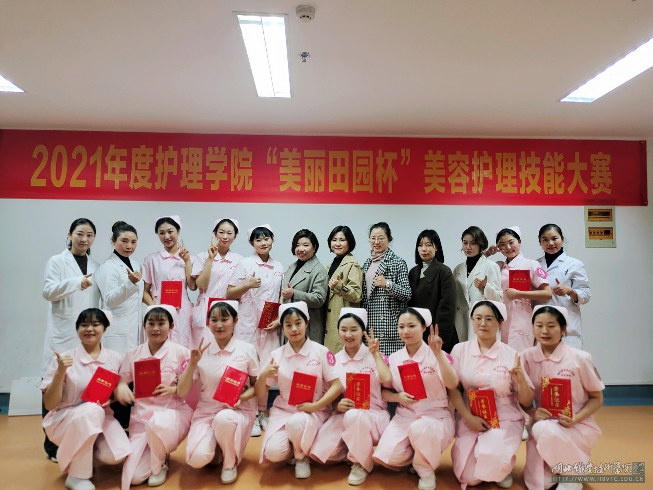 美容技能大赛选手与评委老师合影