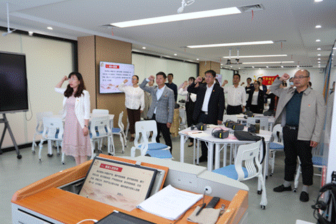 全体起立,面向党旗,举起右拳,王芬同志领誓,全体党员庄严宣誓:“我志愿加入中国共产党,拥护党的纲领,遵守党的章程……”,表达对党的忠诚和热爱,以及为共产主义奋斗终身的决心。