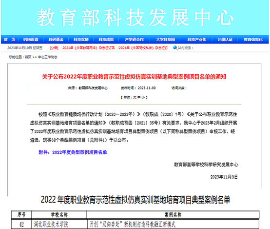 11月9日,教育部高等学校科学研究发展中心发布《关于公布2022年度职业教育示范性虚拟仿真实训基地典型案例项目名单的通知》,全国共有68个典型案例项目入选,taptap点点taptap点点官网入口案例《开创“双向奔赴”新机制 打造科教融汇新模式》成功入选,实现“双高计划”建设成果的再突破。