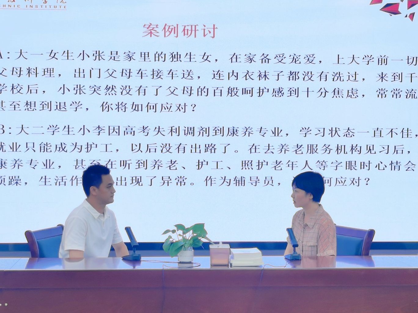 在“案例研讨”环节,taptap点点官网入口辅导员万佳雯和蓝勇福现场模拟研讨情景。两位辅导员围绕两个案例以“你提问 我回答”的方式共同辨析原因、研讨对策、总结方法,最终实现价值认同。