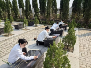 随后,教师党员们来到烈士纪念碑前敬献菊花,朵朵白菊寄托着对英烈的无尽追思。献花仪式结束后,党员教师们手持抹布,俯身轻轻擦拭烈士墓碑。指尖拂去浮尘,目光抚过碑文,斑驳的石刻在春日阳光下愈发清晰。教师们以细致入微的行动还原英烈安息之地的洁净庄严,用无声的守护诉说“山河犹在,吾辈不忘”的承诺,将缅怀之情化作薪火相传的责任担当。