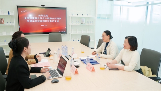 在润方可(上海)生物科技有限公司,李玉荣一行与公司副总裁张叶莉等进行面对面深入交流,双方围绕如何提升学生的实践能力和综合素质,为企业输送具备过硬知识和技能的医美专业管理人才,校企如何共同开展实训基地建设、课程开发、行业标准制定等方面进行探讨。