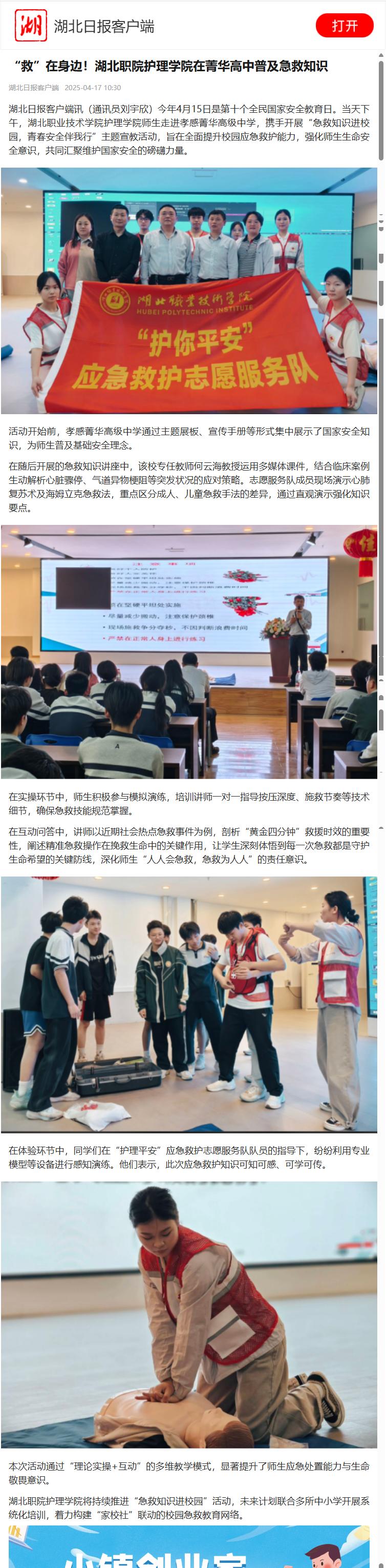 【湖北日报】“救”在身边!湖北职院taptap点点官网入口在菁华高中普及急救知识