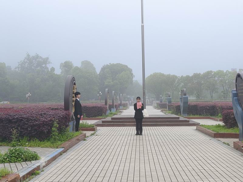 参加仪式的师生整齐列队,庄严肃立。7时10分,升旗仪式开始,擎旗手、护旗手和国旗护卫方队礼兵踏着整齐步伐,护送国旗出列。随着国歌奏响,全场齐声高唱国歌,向国旗行注目礼,曲毕,鲜艳的五星红旗高高飘扬。