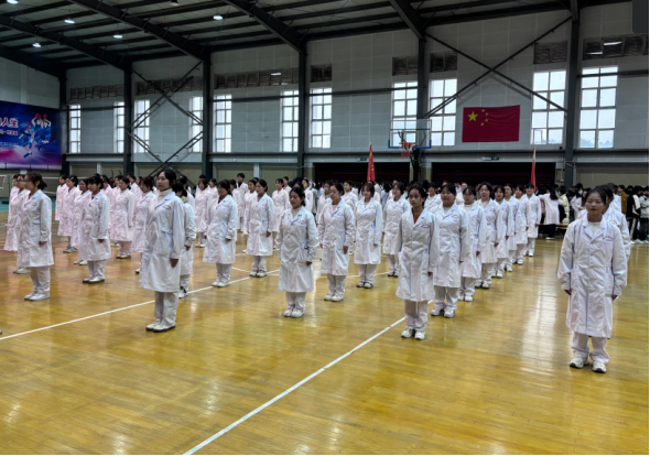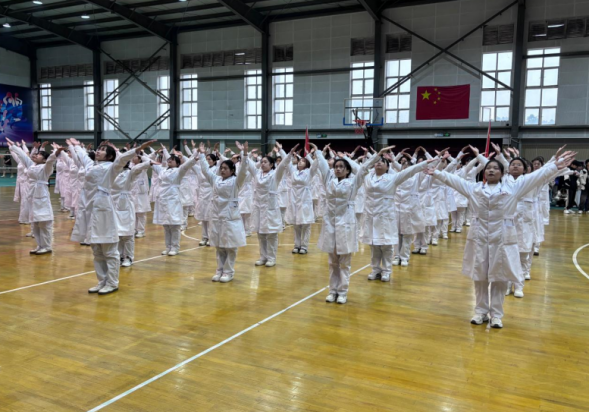选手们身着整洁的服装,以梯形队伍入场竞赛。随着广播体操音乐的响起,选手们伸展、弯腰、踢腿,动作简练到位,标准整齐而富有韵律。护理学子们以饱满的热情、规范的动作展现了青春的活力气息。